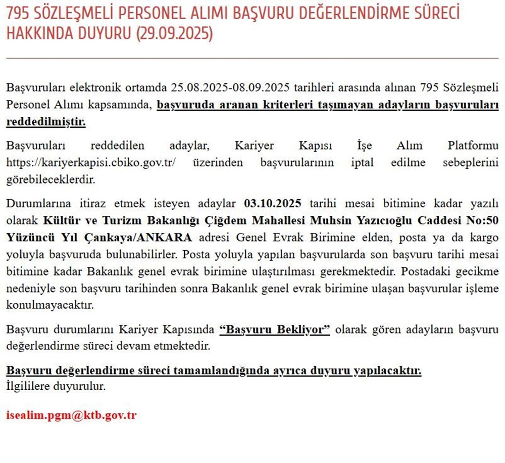 In the published announcement; "Within the scope of 795 Contracted Personnel Recruitment, whose applications were received electronically between 25.08.2025 and 08.09.2025, the applications of candidates who do not meet the required criteria were rejected. Candidates whose applications were rejected can see the reasons for their cancellation on the Kariyer Kapısı Recruitment Platform https://kariyerkapisi.cbiko.gov.tr/. Candidates who wish to object to their status can apply in writing to the General Documents Unit of the Ministry of Culture and Tourism, Çiğdem Mahallesi Muhsin Yazıcıoğlu Caddesi No: 50 Yüzüncü Yıl Çankaya/ANKARA, by hand, mail or cargo until the end of business hours on 03.10.2025. Applications made by mail must be delivered to the General Documents Unit of the Ministry by the end of business hours. Applications that reach the General Documents Unit of the Ministry after the deadline due to delays in mail will not be processed. Candidates who see their application status as "Application Pending" on Kariyer Kapısı The application evaluation process is ongoing. An announcement will be made when the application evaluation process is completed. It is announced to the relevant parties.